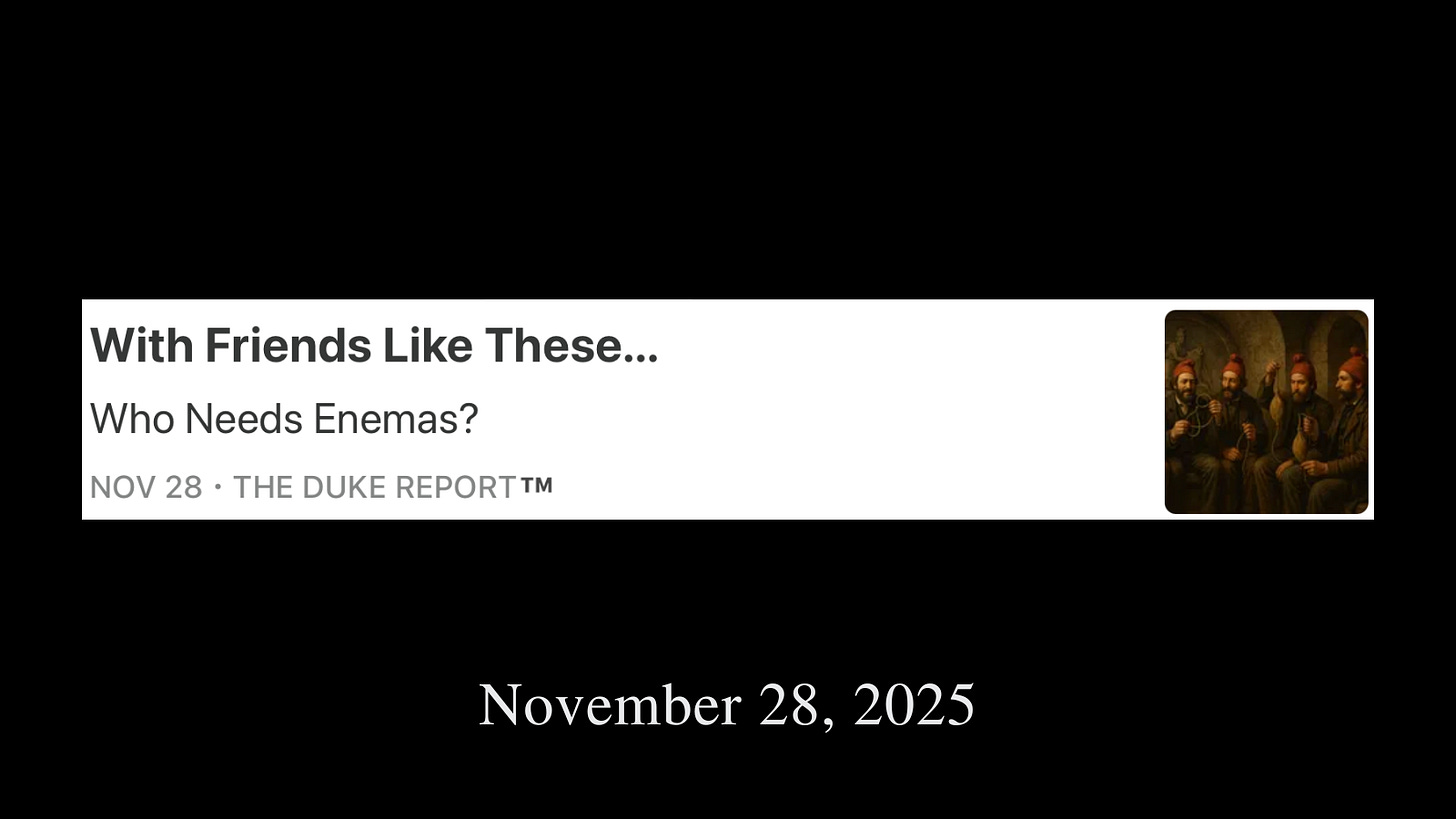 7. Peter Duke’s “With Friends Like These, Who Needs Enemas?” (Nov 28, 2025)