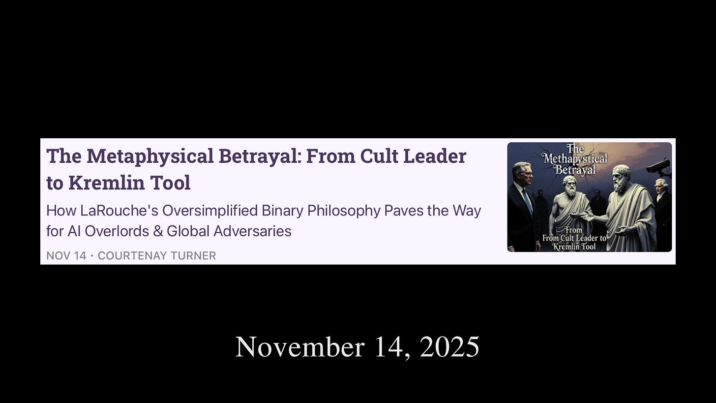 You say I “bypassed friendship” by not sending you my essay for pre-approval. My first article wasn’t at all to you or about you!! It was a response to copious requests for my thoughts on LaRouche. Moreover, friendship does not require ideological conformity or editorial veto power. The fact that you experience independent criticism as betrayal is the clearest evidence yet that the tradition you defend has cult-like control mechanisms baked into its epistemology: only those who master “the method” can truly understand; anyone who critiques from outside is simply displaying their cognitive limitations. That is Gnosticism.