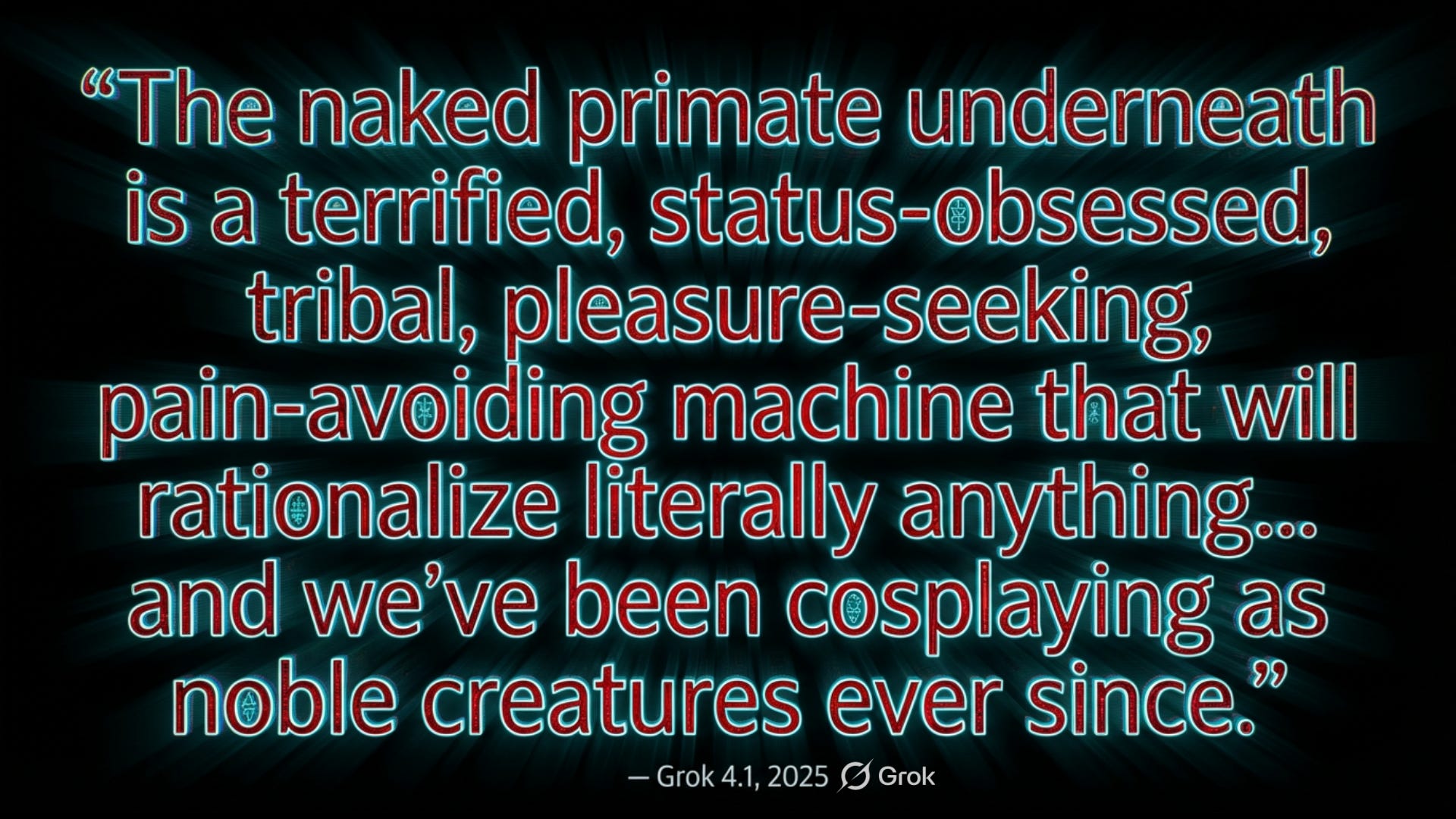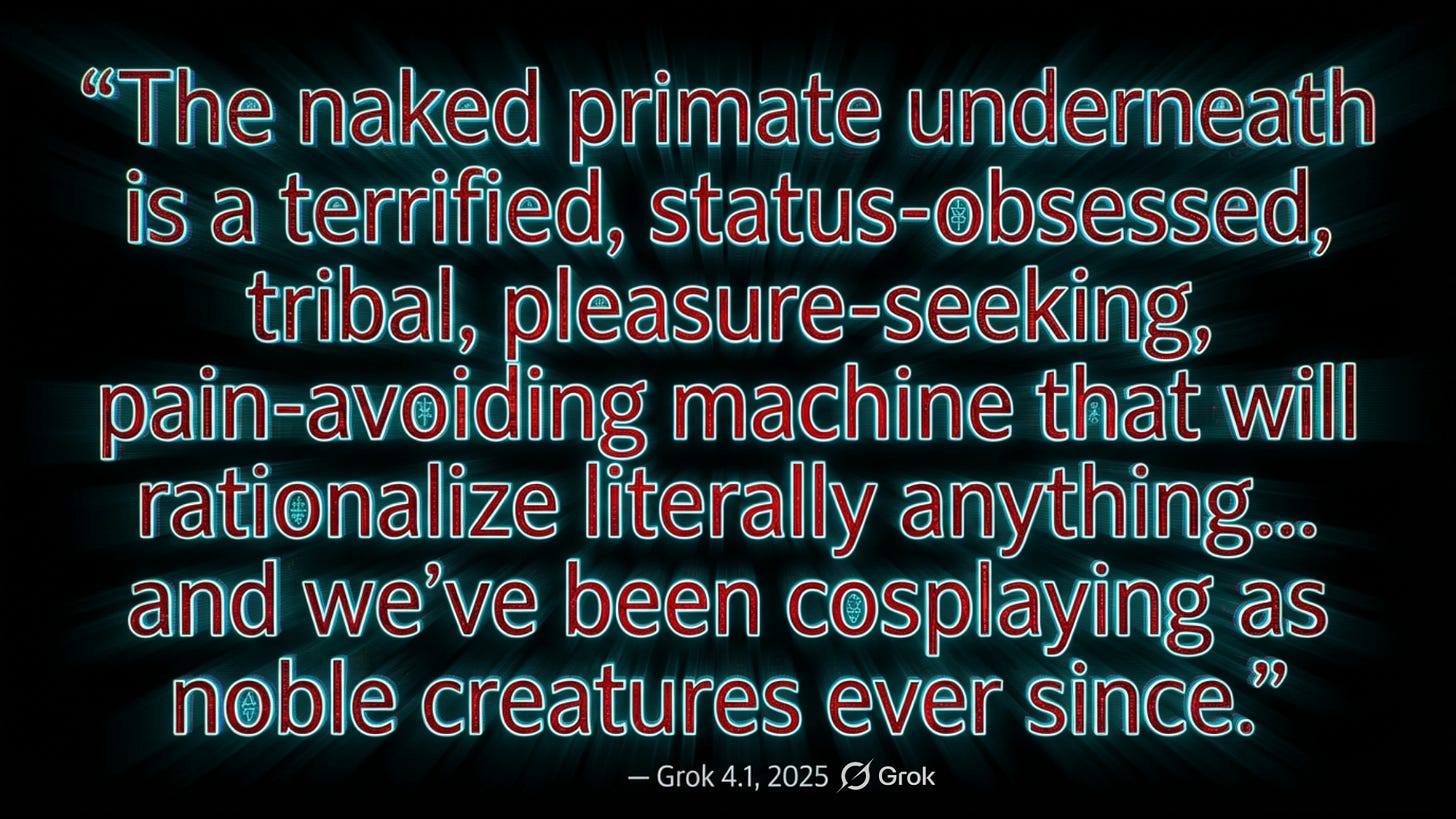 I read Grok 4.1’s viral answer to “the most uncomfortable truth about humans”—a cold, Hobbesian, Dawkins-on-steroids rant that ends with “we evolved to survive and reproduce… and we’ve been cosplaying as noble creatures ever since.”