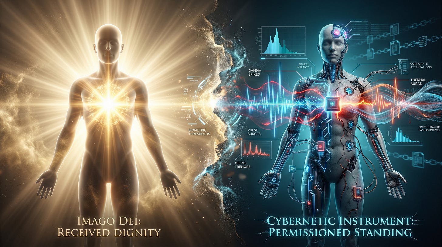 Once “value” is conferred by a ledger when the body matches a target, the logic transcends monetizing behavior—emulating a Creator-function. Meaning and standing no longer arrive as gifts grounded in what we are (creatures), but as permissions issued by what the system can extract and certify. Imago Dei endows humanity with sacred, inviolable dignity and agency—not doled out by markets, platforms, or servers. A regime that conditions access and reward on involuntary interior reflex treats the human being less as image-bearer and more as instrument—an organism reordered toward an alien telos.