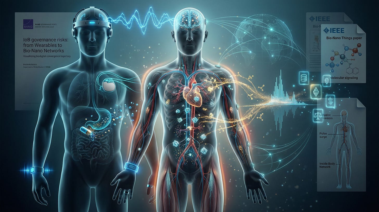 This publication is one illuminating piece in that landscape: it ties physiological measurement to economic validation and reward. The trajectory doesn’t stop at wearables. A more radical horizon already exists in the engineering literature: the Internet of Bio-Nano Things—networks of biological and nanoscale devices (from nanobiosensors to engineered cells) designed to operate inside the body, exchange information through non-conventional channels such as molecular signaling, and interface outward to the wider internet through bio-cyber gateways. This is the same movement, just one layer deeper: the body not merely as something that wears sensors, but as something that hosts a network—where measurement becomes continuous, intervention becomes granular, and “participation” can be tethered to what the system can read and verify.