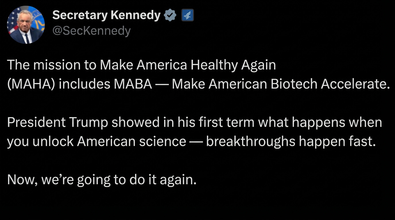 @SecKennedy. “Make American Biotech Accelerate (MABA)” tweet (MAHA / MABA framing), X, June 20, 2025.