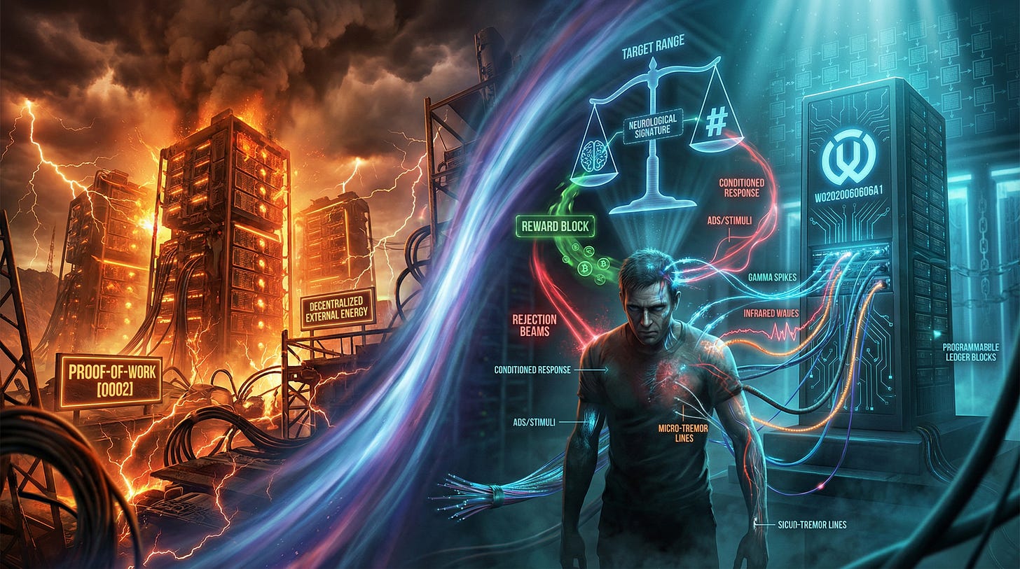 On its face, the publication describes a cryptocurrency mining/validation method that uses human body activity associated with a task as raw material for generating proof-of-work. It’s pitched as efficiency: replacing massive computation with human activity signals. But the deeper breach is political, spiritual, and metaphysical.