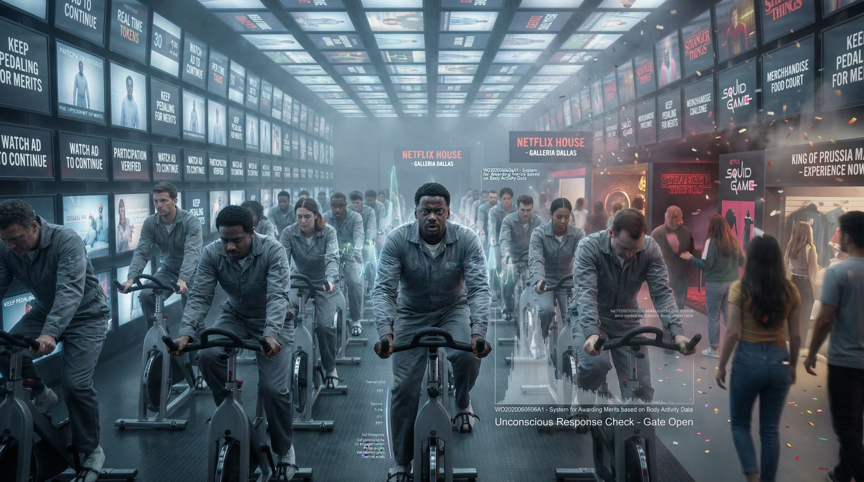 In Black Mirror’s “Fifteen Million Merits,” the individual exists inside a closed loop where screens administer life, tokens quantify participation, and ads are not optional ambience but a kind of environment—avoidable only by paying, performing, or submitting to the system’s terms.