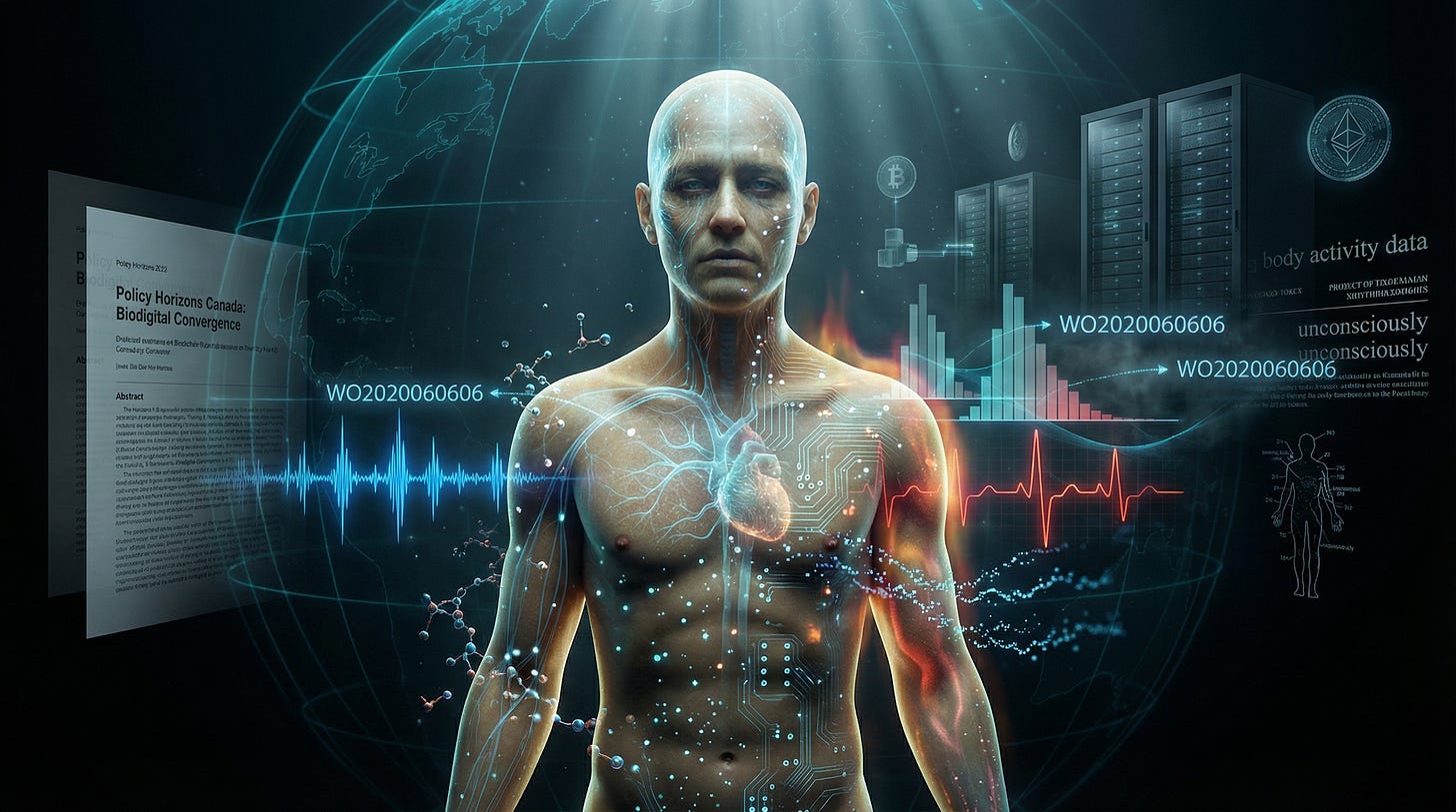 Many readers will have encountered the term “biodigital convergence”—the deliberate fusion of biological systems with digital technologies, sensors, and networks. When Policy Horizons Canada released its 2020 report Exploring Biodigital Convergence, it coincided with a surge of public discussion around a strikingly numbered Microsoft patent application: WO2020060606A1, published the same year, which explicitly proposes using human body activity data (brain waves, heat, blood flow, and other physiological signals) as proof-of-work in a cryptocurrency system. At the time, the patent’s “666” numbering and its description of unconsciously harvested body signals fueled widespread theories—some dismissed as fringe, others prescient.